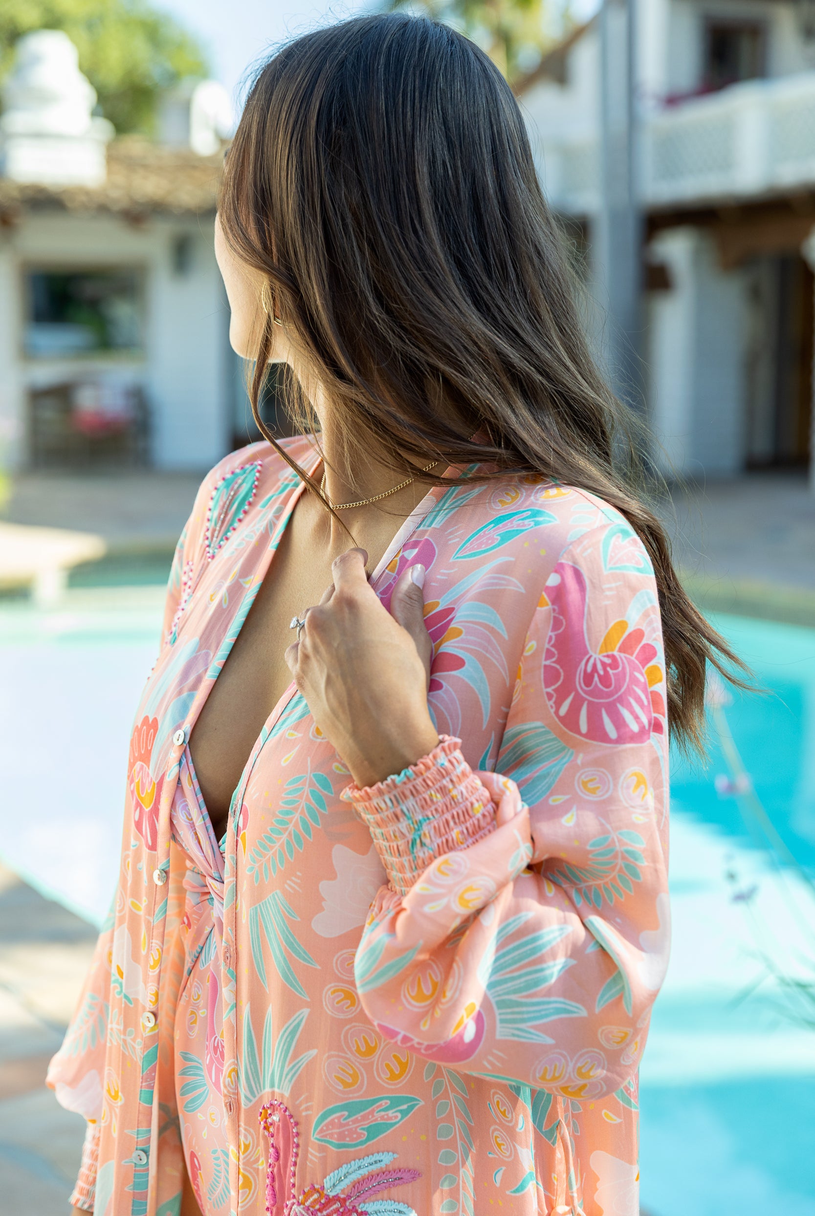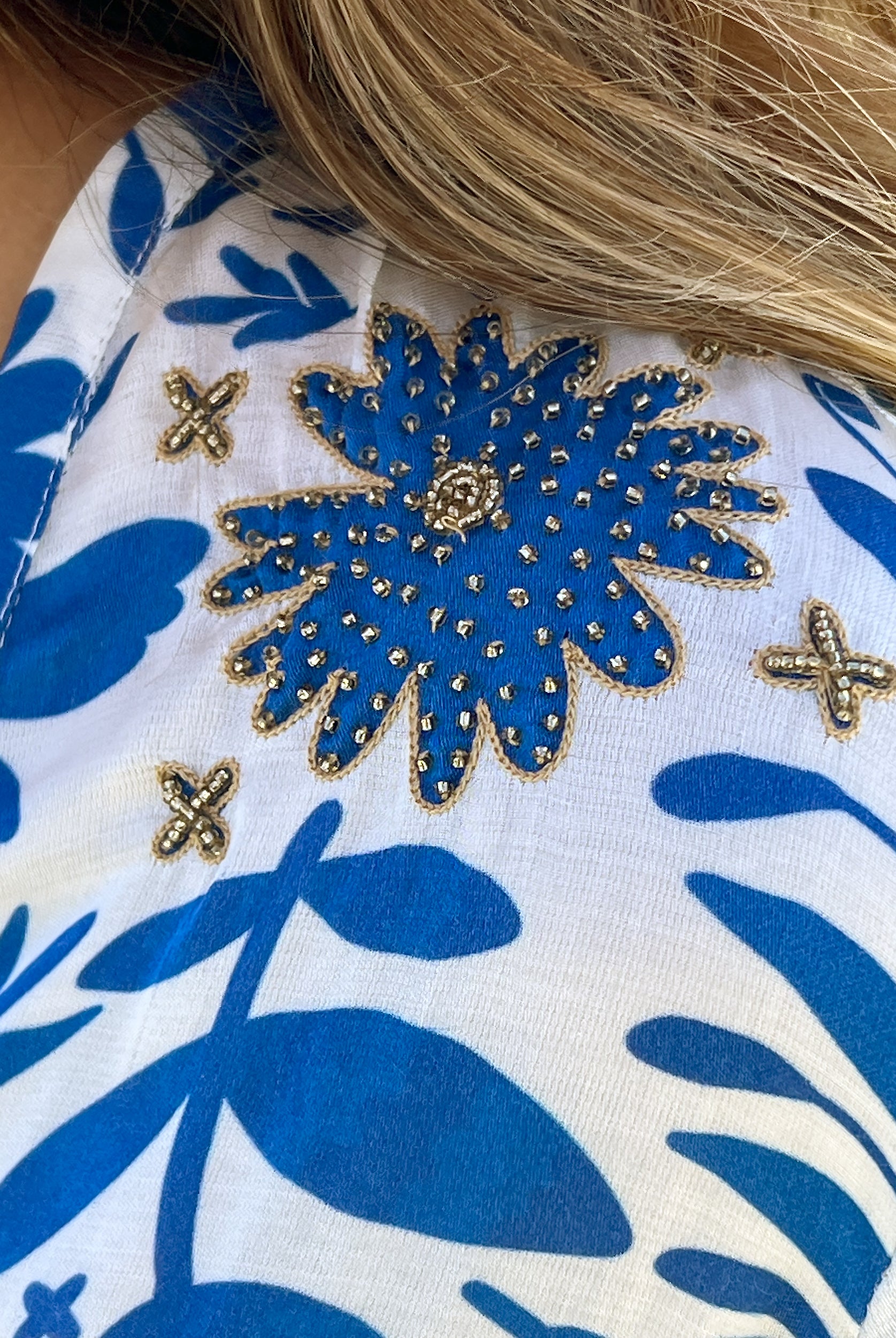Each piece features unique hand embroidery and beading, crafted with love by skilled artisans. The waist belt with playful tassels adds charm and the perfect fit.